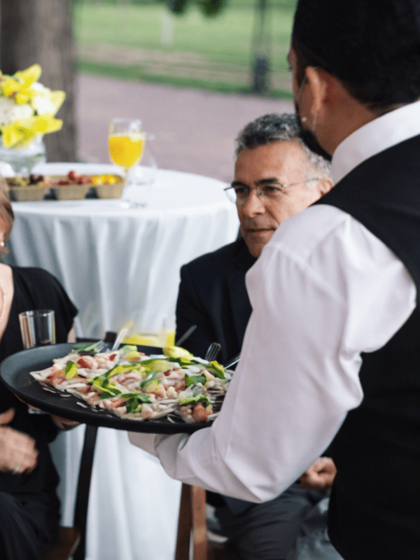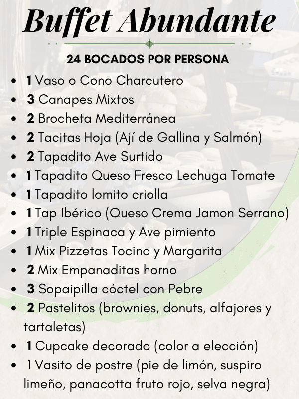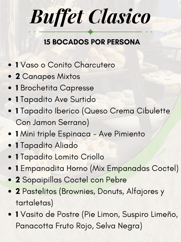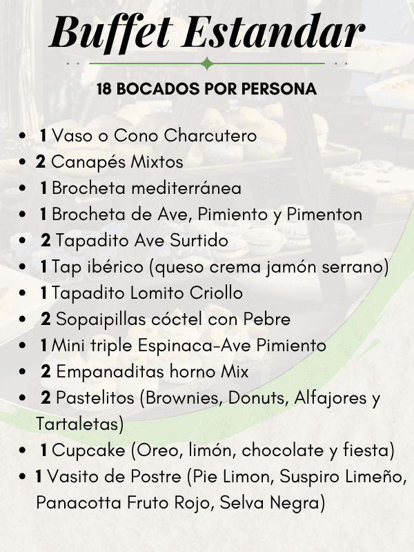 Incluye montaje y desmontaje completo, personal para reposición durante el evento, mesones, mantelería, decoración floral, implementos de presentación y transporte.