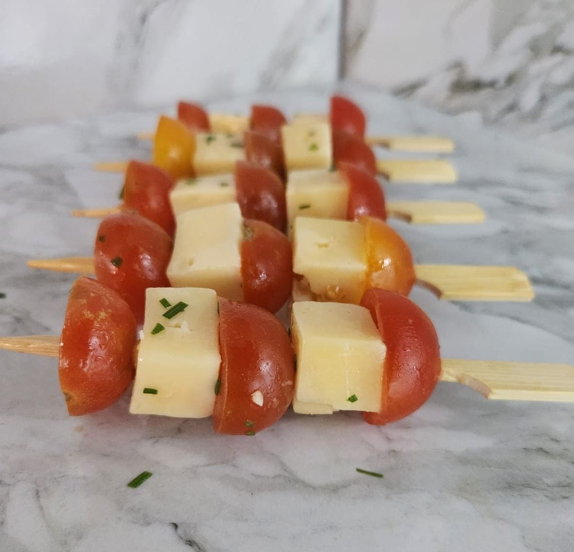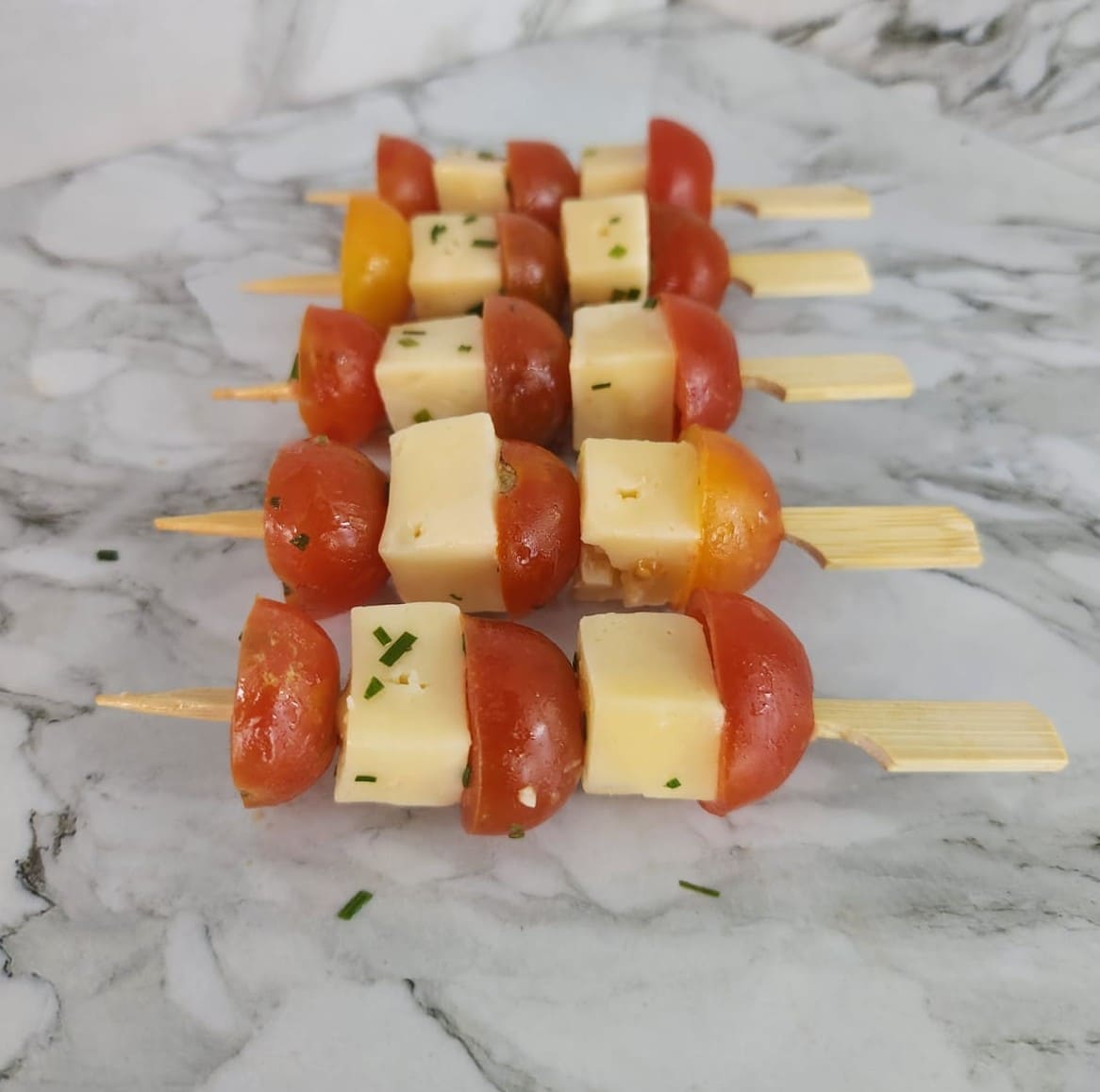 Brochetitas con queso gauda y tomate cherry, aliñadas en aceite de oliva y ciboulette, decoradas con una deliciosa salsa pesto.