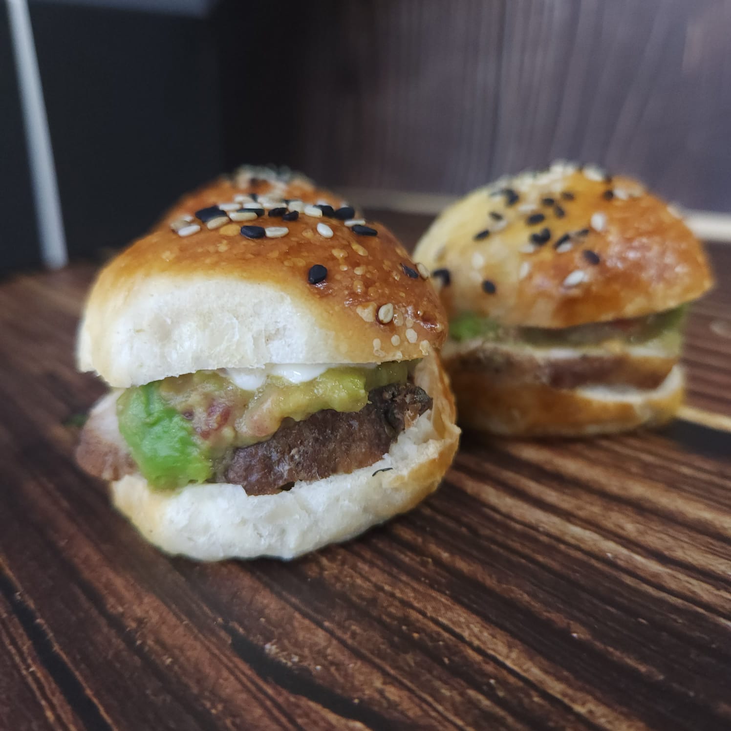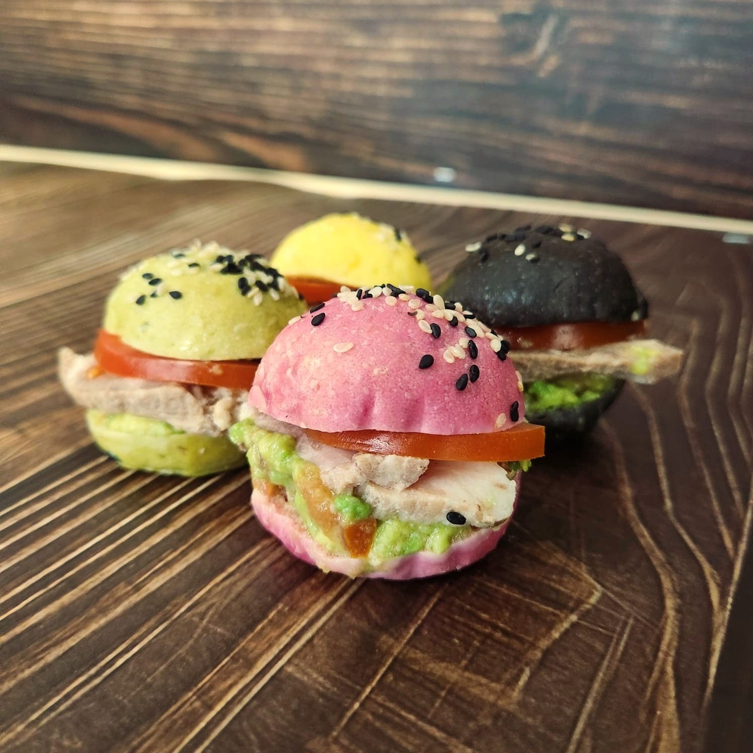 Mini sándwich con lomito de cerdo, palta y tomate en pan suave. Sabrosos, jugosos y listos para servir.